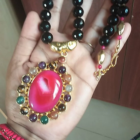 Hand-crafted Agate multifacet Black beads with Chalcedony multicolour pendant